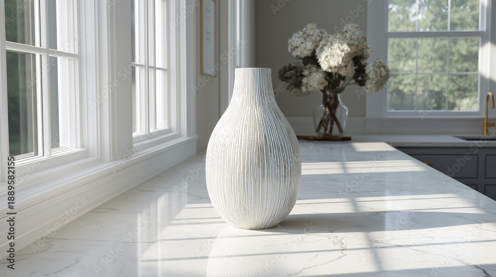 • Minimalist white ceramic vase on marble countertop in bright modern kitchen