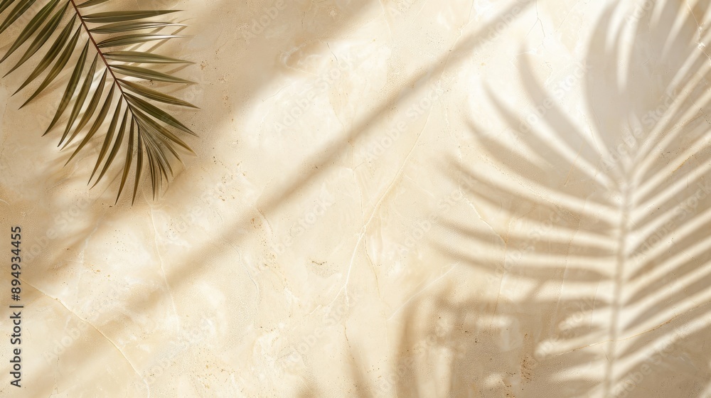 Marmur - Beige marble background with palm leaf shadow, top view. Natural material in sunshine. Summer... #894934455