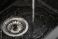 Czarny - Woda spływająca w zlewie, zbliżenie na czarny zlew i srebrne sitko w odplywie #1196545586