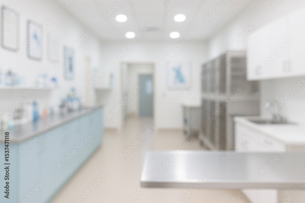 • Modern veterinary clinic interior with exam table and equipment, clean bright animal hospital, pet healthcare concept, blurred background for copy space, professional vet office design