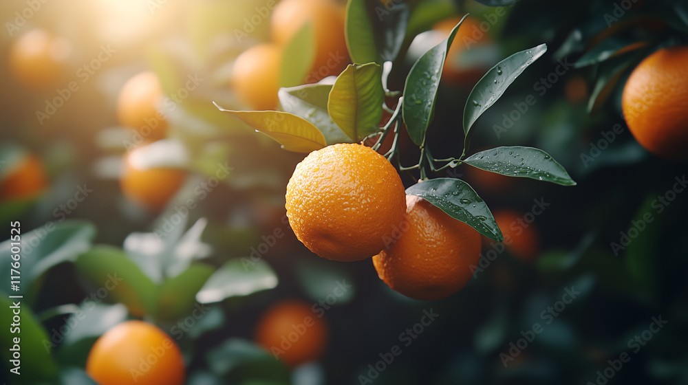 • Bunch of fresh ripe oranges hanging on a tree in orange garden