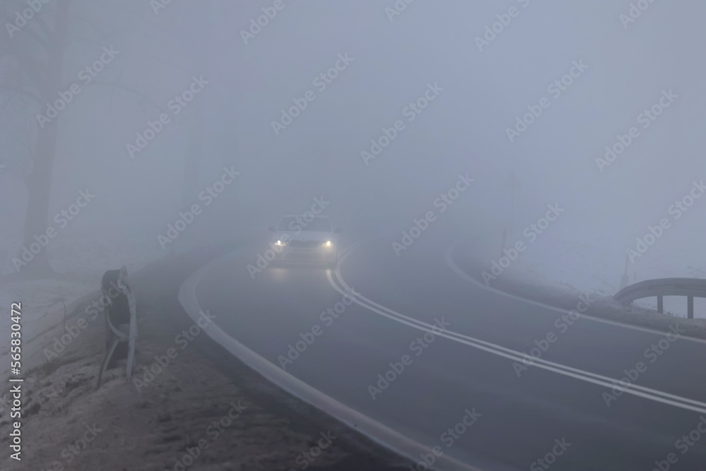 Fototapeta Pojazdy - Samochody we mgle gęstej na drodze wieczorem. Niebezpiecznie. #565830472