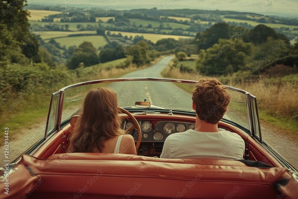 Obraz Pojazdy - Couple driving classic convertible car on country road through green hills #1262914413