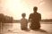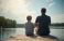• Man and boy fish on lake pier. Father teaches son angling. Family relax on lake summer vacation. People enjoy fishing together on beautiful nature outdoors.