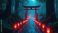 • Red torii gate and glowing lanterns line a wet stone path in a foggy Japanese forest at night. Rain falls on trees surrounding the mystical illuminated walkway. Serene scene.
