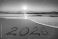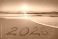 • Happy New Year 2026 concept, lettering on the beach. Sea sunrise