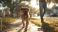 • Sunny evening walk with a happy dog along the neighborhood sidewalk