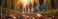 • People walk in autumn forest collecting rubbish in blue bags. Community cleanup volunteers clean park path. Adults and children gather garbage, protect nature.