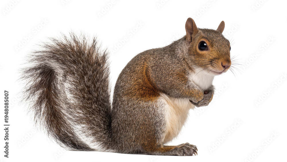 • Isolated cute grey squirrel standing upright with fluffy tail, paws clasped attentively