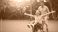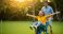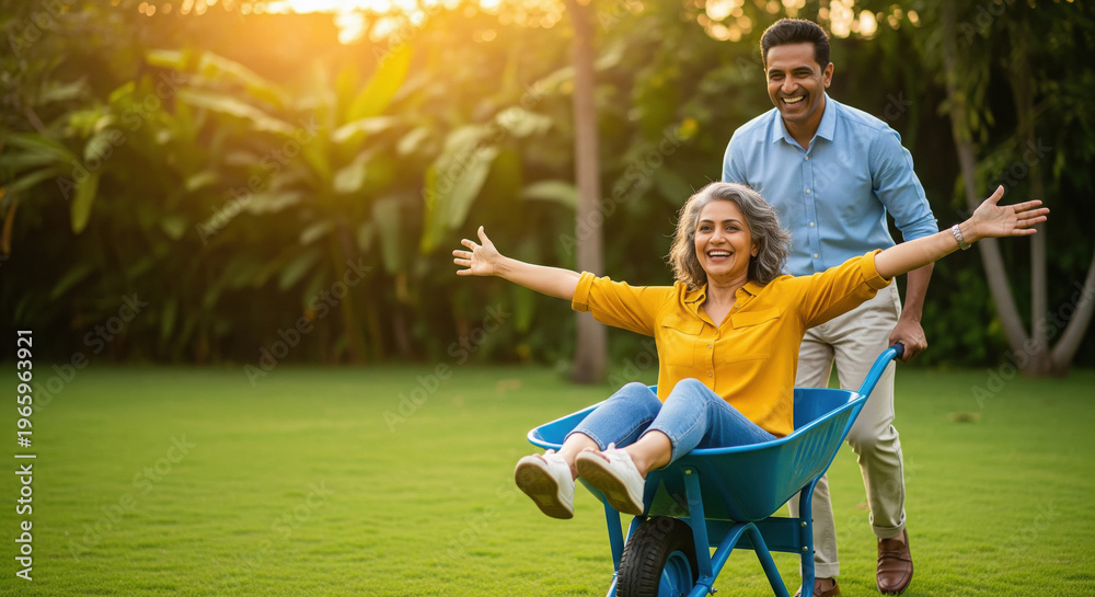 • Joyful man pushes woman in wheelbarrow, outdoor fun.