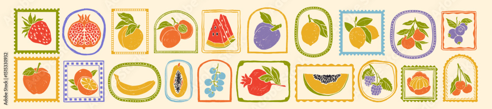 Summer fruit berry print, vintage hand drawn cartoon citrus illustration doodle charcoal texture set. Colorful organic retro sticker design, fresh lemon, apple nature logo stamp. Summer fruit icon