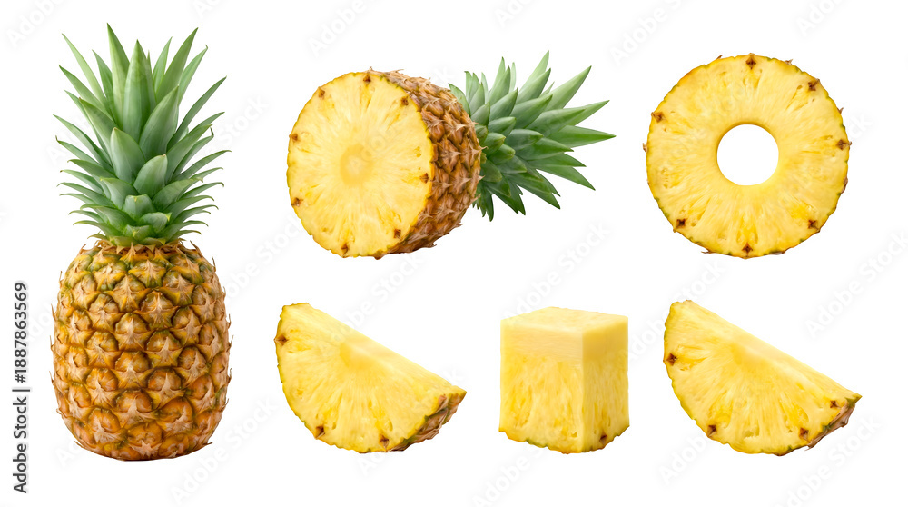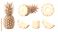• Fresh pineapple fruit collection with whole slices and chunks isolated, PNG with Transparent Background