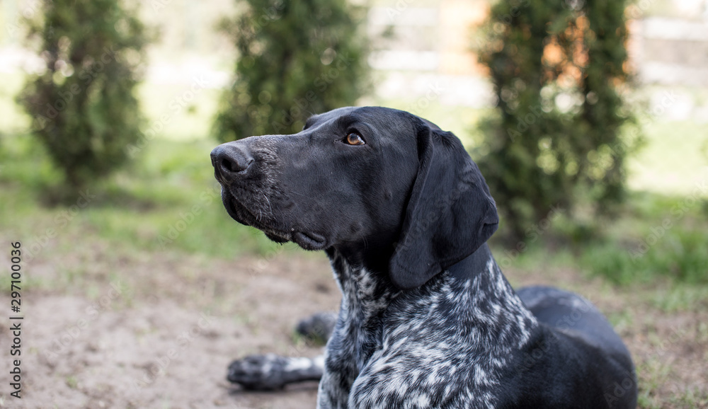 • Wyżeł niemiecki z profilu. Pies w ogrodzie. Szczeniak.