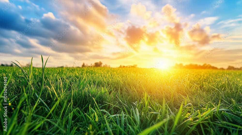Panel Szklany Trawa - Zielona trawa pokrywa wzgórza, które spływają w dół w kierunku zachodzącego słońca. Z nieba... #1015094163