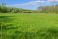• Duża łąka zarośnięta zieloną trawą w słoneczny dzień z delikatnie zachmurzonym niebem