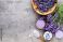 Panel Szklany Lawenda - Essential lavender salt with flowers top view. #211359807