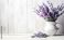 • fresh lavender flowers and herbs on white wooden table background