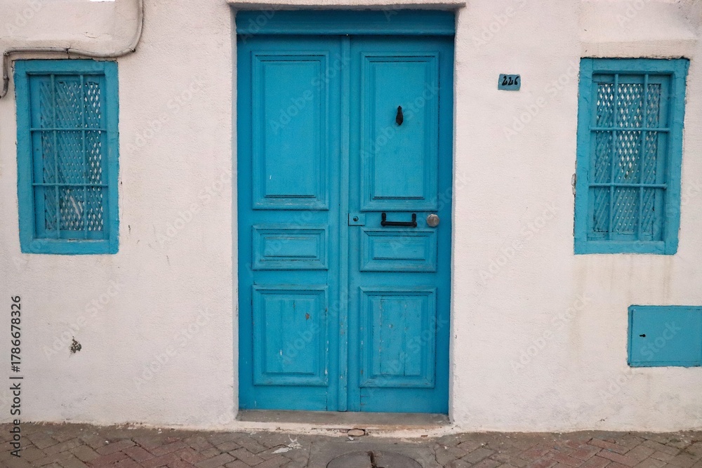 Panel Szklany Kamień - stare drzwi w portowym miasteczku Mahdia, Tunezja. #1786678326