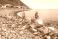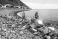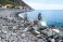 Czarna plaża - tło. Ciemny piasek i kamienie oraz spienione morskie fale