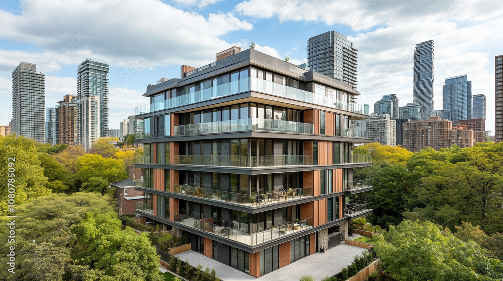 Panel Szklany Panorama - Współczesny budynek mieszkalny z dużymi oknami i licznymi balkonami, wkomponowany w tętniący... #1080785092