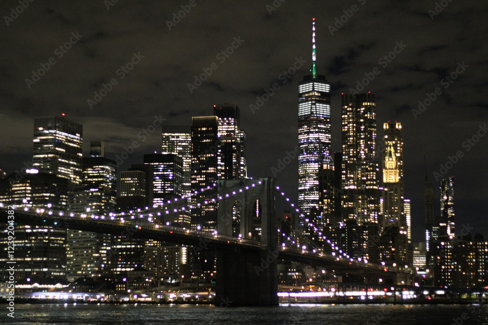 • Nocny widok na Brooklyn Bridge i panoramę Manhattanu z DUMBO. Oświetlony most, refleksy w wodzie i tętniące życiem miasto tworzą niezapomniany klimat Nowego Jorku.