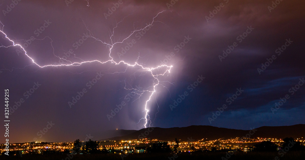 Panel Szklany Panorama - Burza nad górami i miastem nocą #321449215