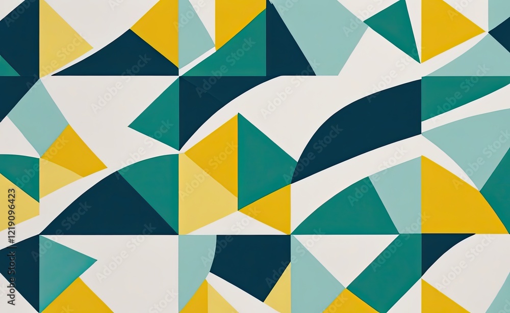 • A vibrant abstract geometric pattern with intersecting shapes in shades of yellow, teal, green, and white.