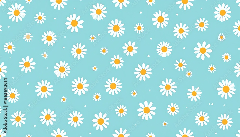 • Cheerful daisy field on pastel blue backdrop in playful repeat pattern art