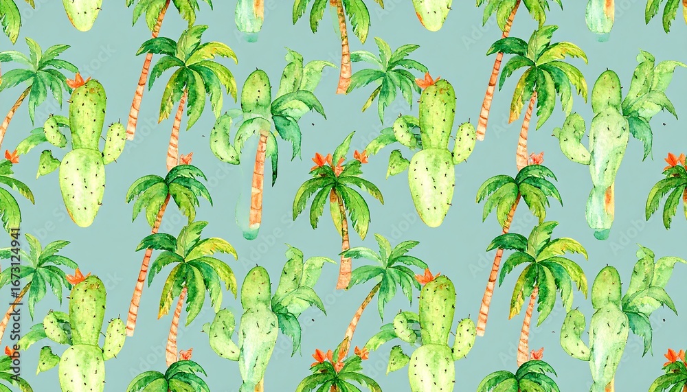• Watercolor pattern of cactuses and palm trees creating a tropical desert vista filled with