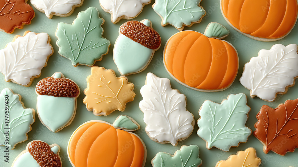 • Decorated autumn sugar cookies shaped like pumpkins, acorns, and leaves in pastel orange, green, white, and tan icing, arranged flat on mint background evoking cozy seasonal celebration