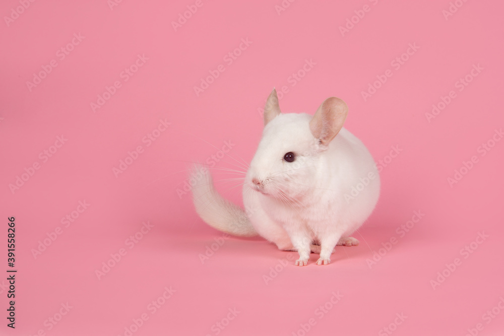 • Cute white chinchilla seen from the front on a pink background