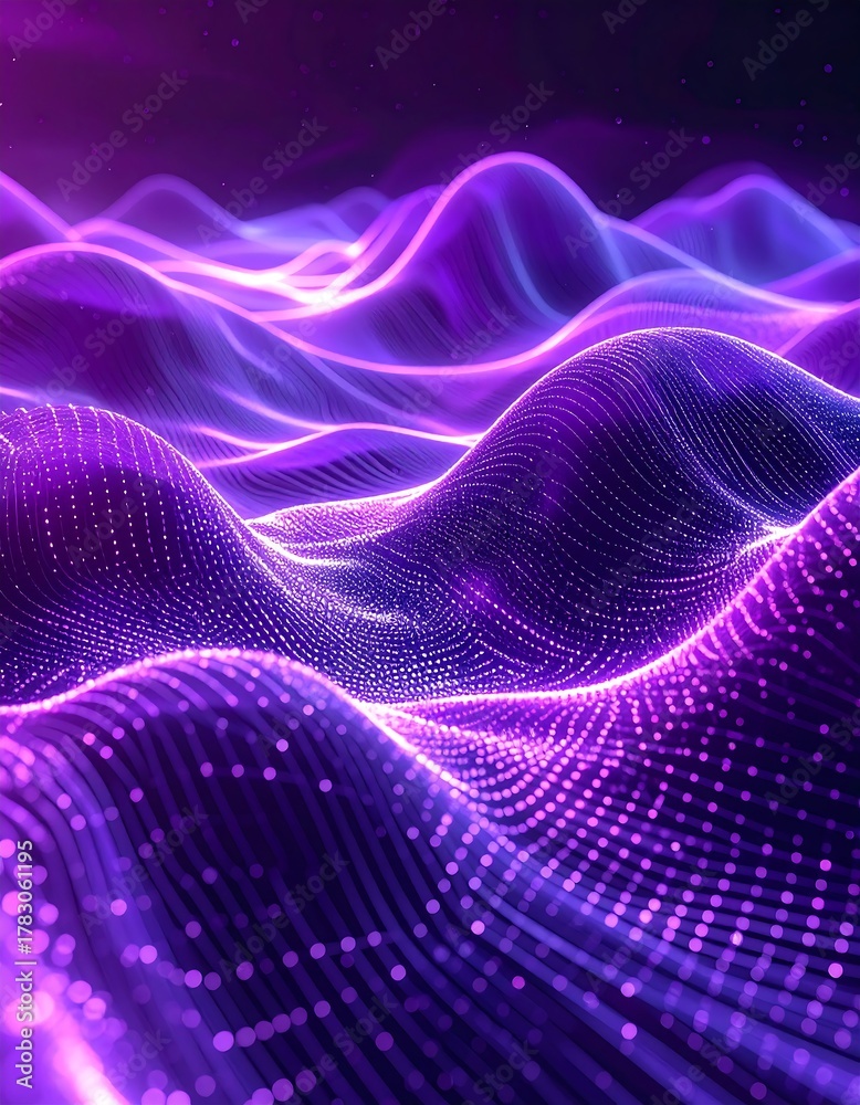 • An abstract, digital rendering showcasing undulating, luminescent, wave-like forms. Brilliant shades of violet and purple create depth and dimension