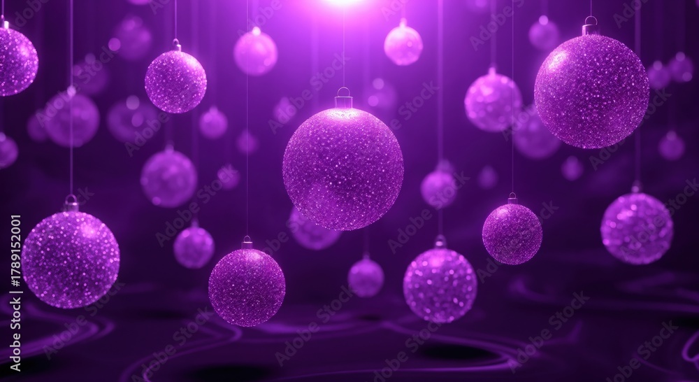 Chabrowy - Sparkling purple glitter Christmas ornaments hanging in a festive dark background with glowing... #1789152001