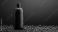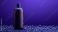 • Dark Matte Bottle with Water Droplets on Textured Purple Background and Reflective Surface.