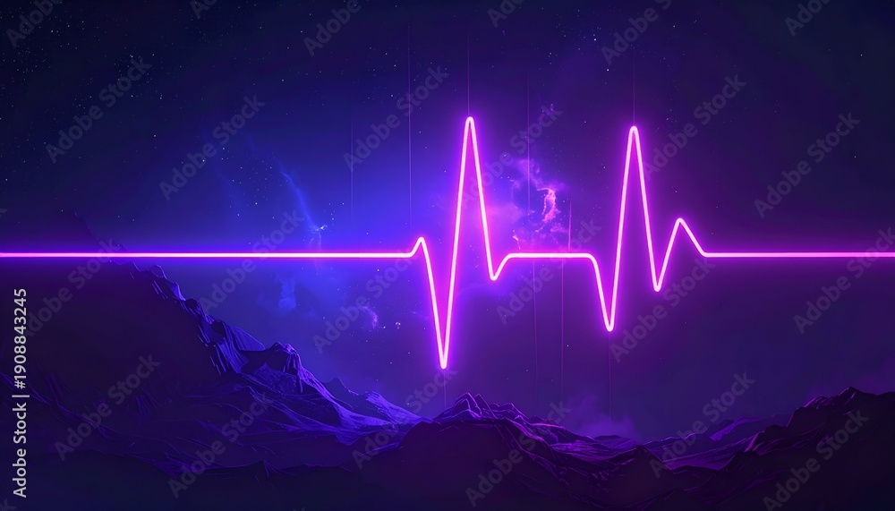 • Neon heartbeat line glows over mystic, starry, mountain landscape
