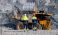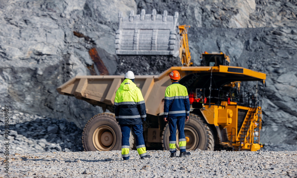 • Work team engineers supervise loading of gold ore by excavator into large quarry yellow truck. Concept open pit mine industry.