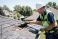 • Contractor in safety gear inspecting damaged roof shingles and holding a clipboard