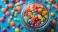 • Brightly colored candy jar showcases vibrant sweets in playful arrangement on a blue background