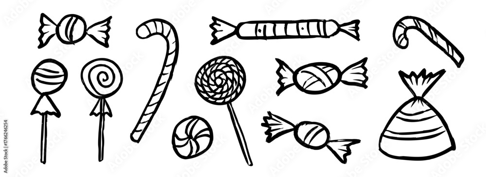 • Hand drawn candy doodle set. Sketched wrapped sweets collection with candy canes, lollipops, mints. Festive decoration for birthday party, Halloween, Christmas holiday. Vector sweet wrapper pack