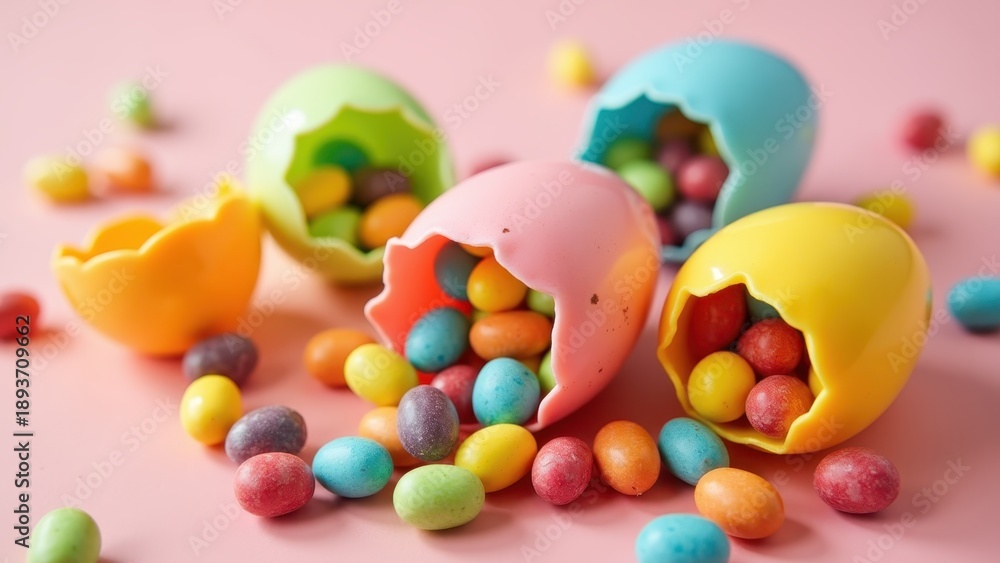 • Candy filled Easter eggs, jellybeans chocolates inside, plastic shells opened, colorful sweet treasures, bright sugar candy