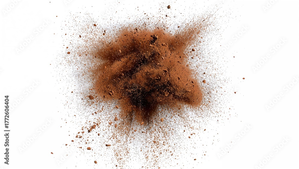 • Brown dust and dry soil explosion against a white backdrop, potential allergen risk