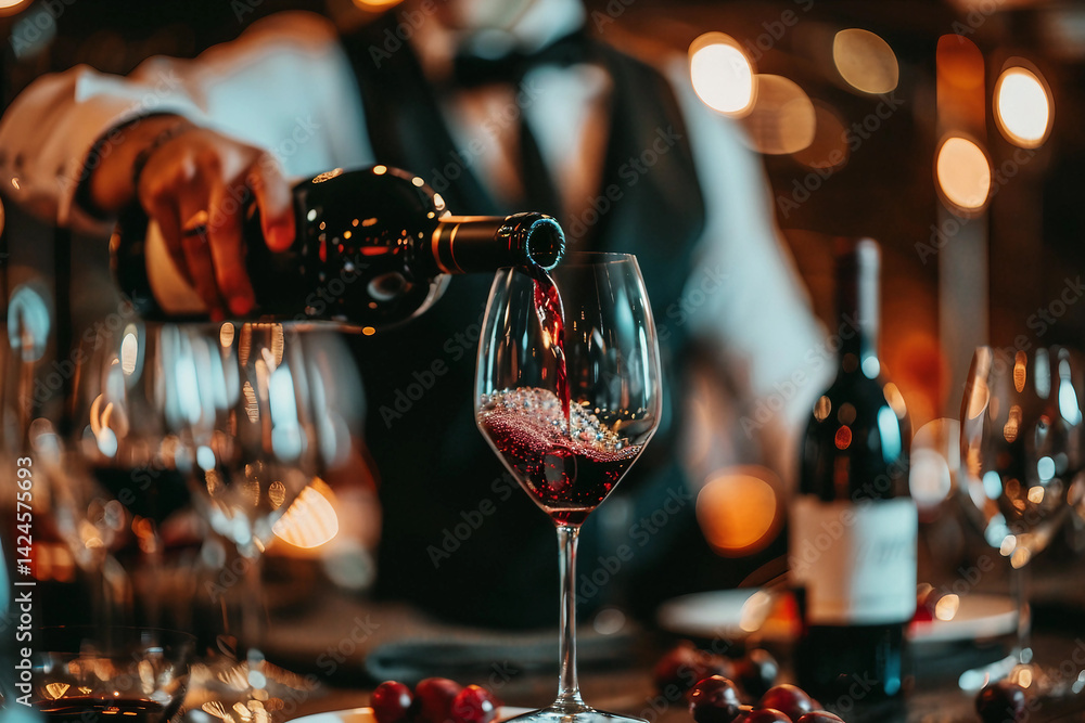 • Generative AI image sommelier pouring wine into glasses during formal tasting event in luxurious restaurant wine storage winery