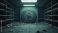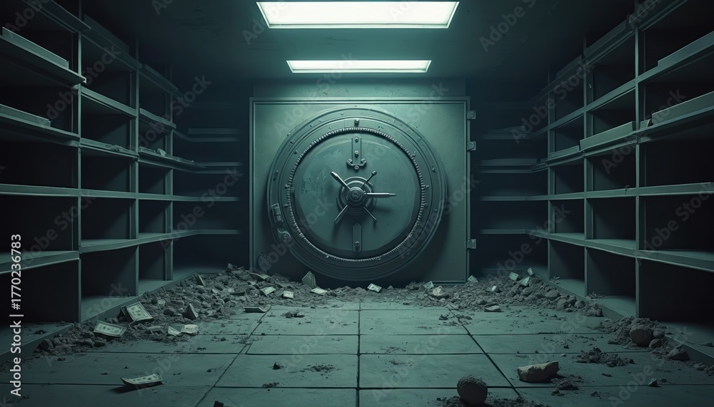 • Metal vault door shut in empty bank safe room. Bare shelves line walls inside chamber. Scattered money, debris cover dirty floor. Scene suggests financial crisis, loss, theft aftermath, economic