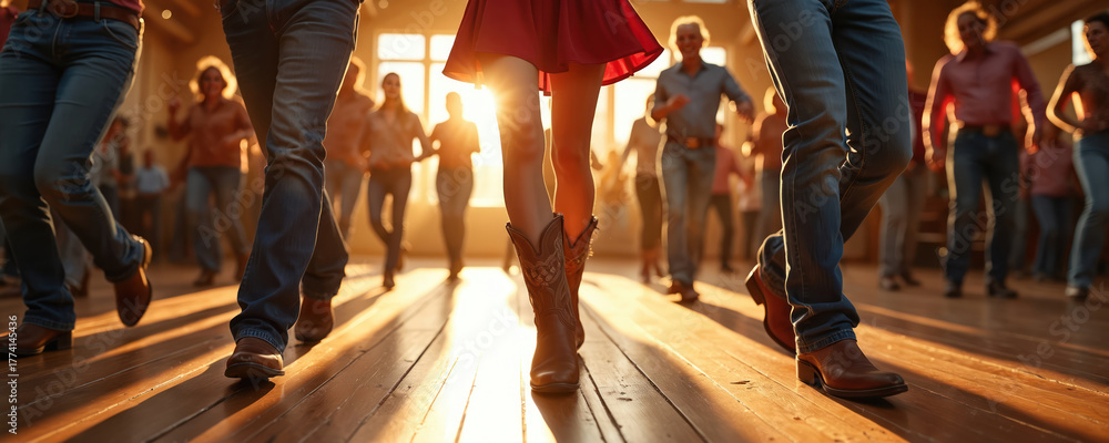 • Illustration captures line dancing in a wooden hall. People in jeans and cowboy boots enjoy country music. Group performs energetic dance moves on the floor. Sunlight illuminates the scene.
