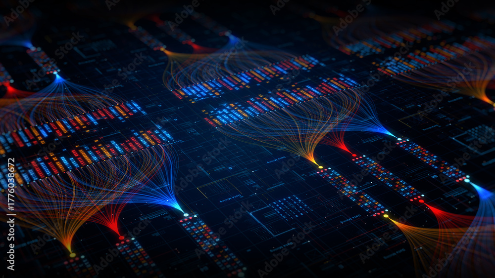 • Abstract digital data stream visualization showing network connections, data flow, and a futuristic information processing system. Ideal for tech, AI, and IT concept designs. 3d Rendering