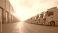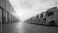 • Lineup of white semi-trucks parked in front of a logistics warehouse. The setting sun casts long shadows on the concrete lot, illuminating the parked fleet. These vehicles await transport or charging.