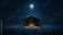 • The star of Bethlehem shines over an empty manger in a wooden stable. Traditional nativity scene on a snowy winter night. Christian Christmas holiday concept