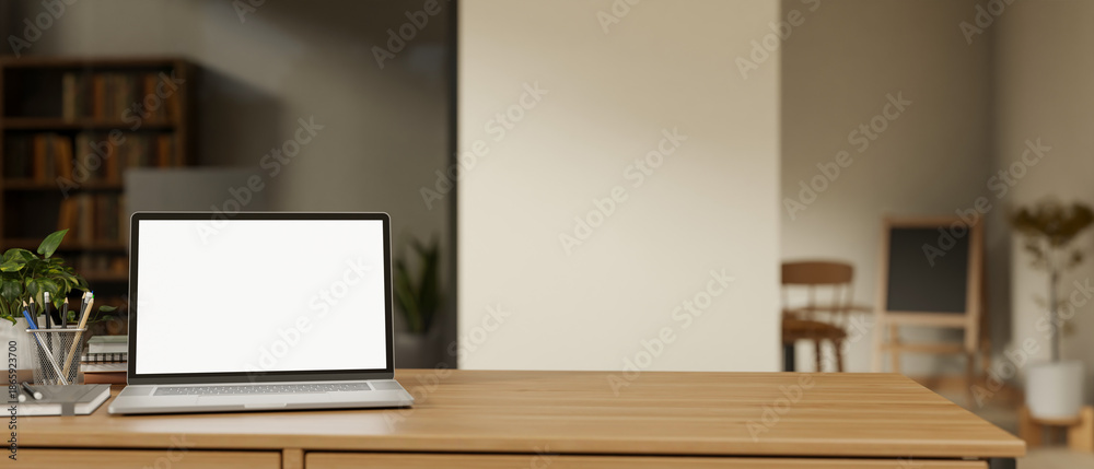 Rośliny - Blank screen laptop with book and pencil on wooden table across glass wall in a living room or cafe. #1865923700