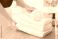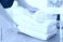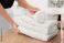• Young chambermaid with clean towels on table in bathroom, closeup