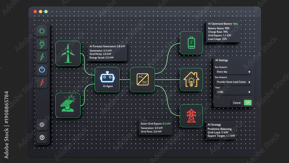• Smart energy management dashboard interface with AI technology, renewable power, solar panel, wind turbine and battery status icons, dark mode UI design- 3D rendering